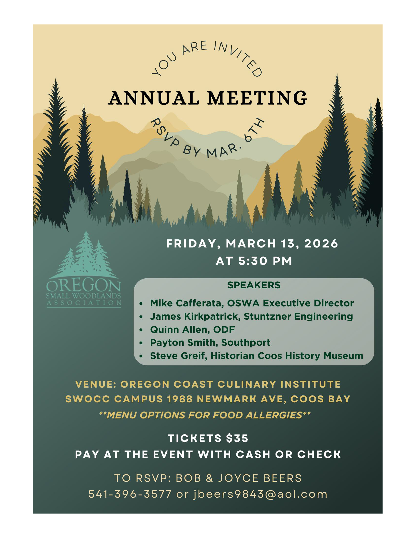 You are Invited to the Annual Meeting of the Coos-Curry Small Woodlands Association on March 13, 2026 at 5:30 pm.