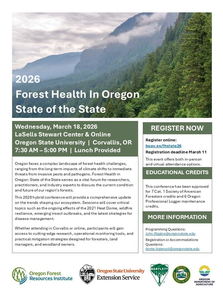 In-person:$85, Virtual:$35. Oregon faces a complex landscape of forest health challenges, ranging from the long-term impacts of climate shifts to immediate threats from invasive pests and pathogens. Forest Health in Oregon: State of the State serves as a vital forum for researchers, practitioners, and industry experts to discuss the current condition and future of our region's forests. This 2026 hybrid conference will provide a comprehensive update on the trends shaping our ecosystem. Sessions will cover critical topics such as the ongoing effects of the 2021 Heat Dome, wildfire resilience, emerging insect outbreaks, and the latest strategies for disease management. Whether attending in Corvallis or online, participants will gain access to cutting-edge research, operational monitoring.