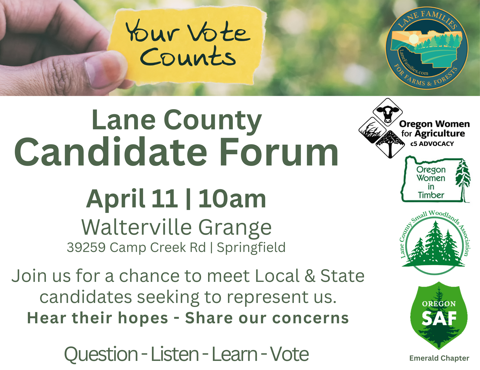Candidates with a Lane County constituency have been invited to participate in this event, with a particular but not exclusive emphasis on the eastern portion of the county (County Commissioner positions 1, 2 & 5, House District 12 and Senate District 6). Currently nine candidates have said they are planning to attend!